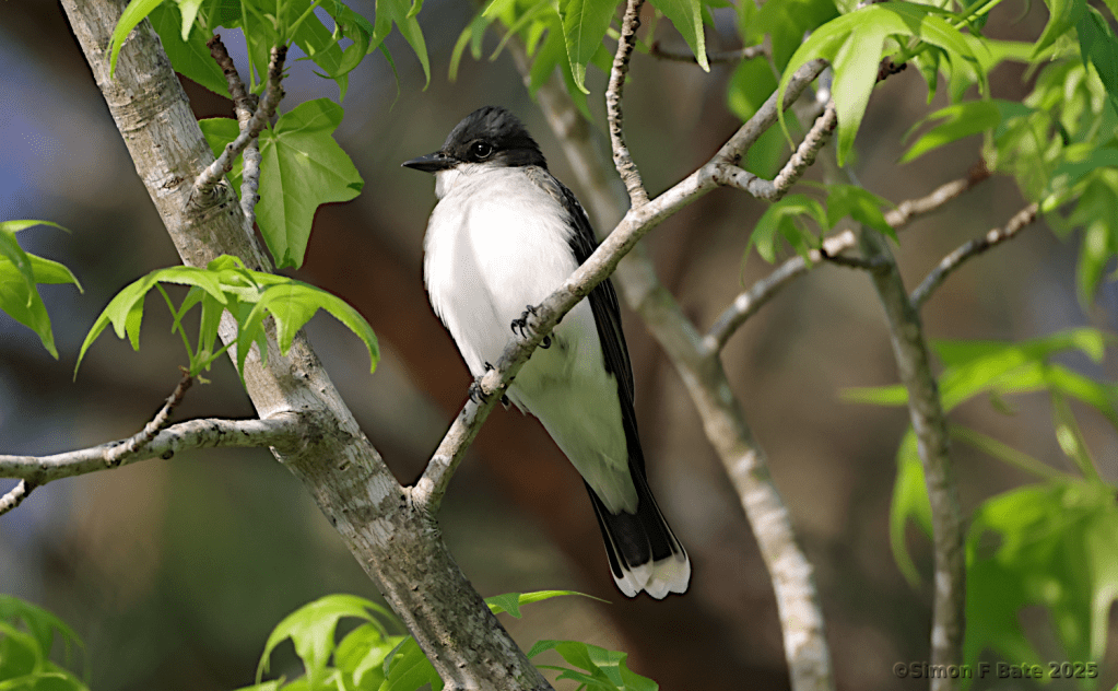 Eastern Kingbirds stand out because of the white band across the end of their tail. They’re some of the most aggressive birds I know. I’ve seen them chase hawks and crows away with no fear at all.