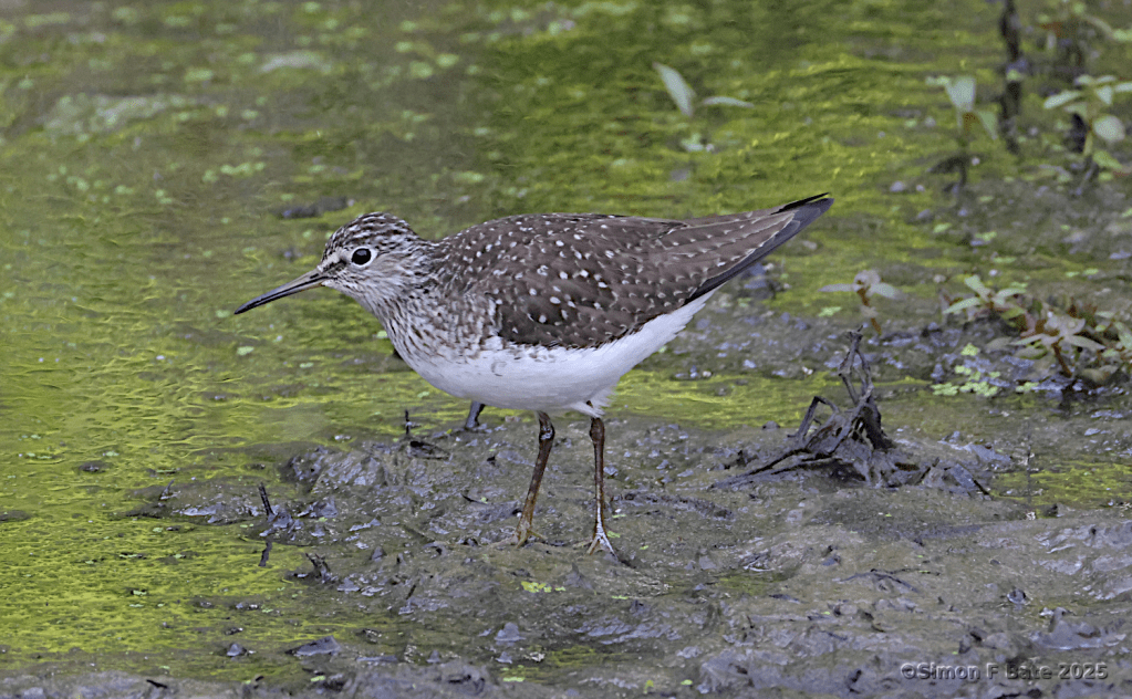 In past summers, I’ve encountered Spotted Sandpipers around the pond and in the settling pond behind the Seagroves townhouses. Last week I got a surprise to encounter a Solitary Sandpiper, in its breeding plumage, at the settling pond. I saw a pair of sandpipers flying today, but didn’t get a close enough look at them to get an identification.