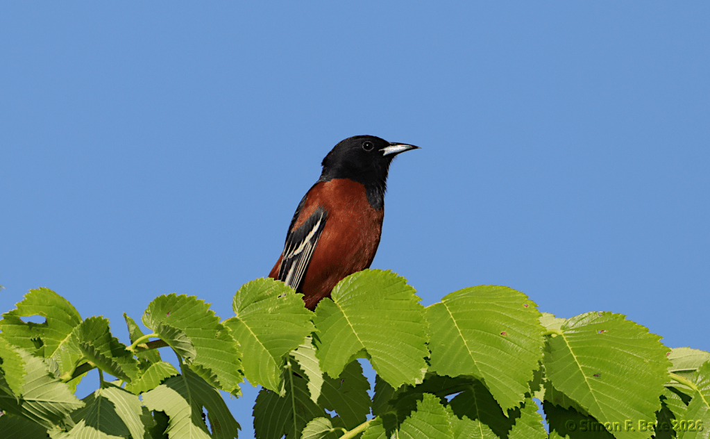 I think this next one is a lifer for me. I’m working on consolidating my life list on eBird, but it’s not fully populated yet. Merlin identified the song before I saw this Orchard Oriole. When I did, I was quite happy. (I was also happy that it chose such a nice spot in which to be photographed.)