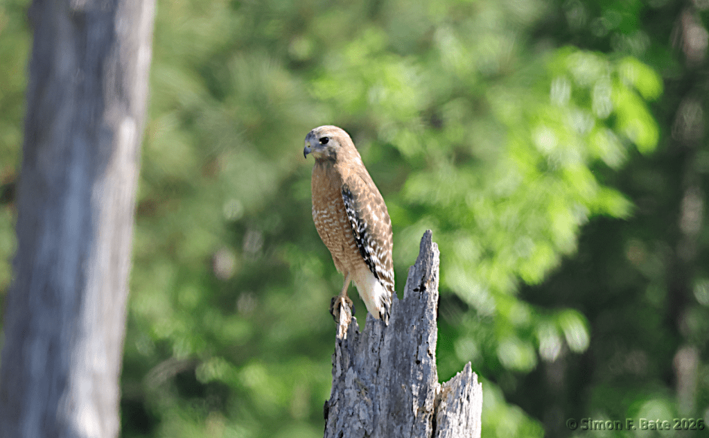 I saw a Red-shouldered Hawk on the hunt. It flew across my path several times. This one seems lighter in color than those that we usually see at Seagroves.